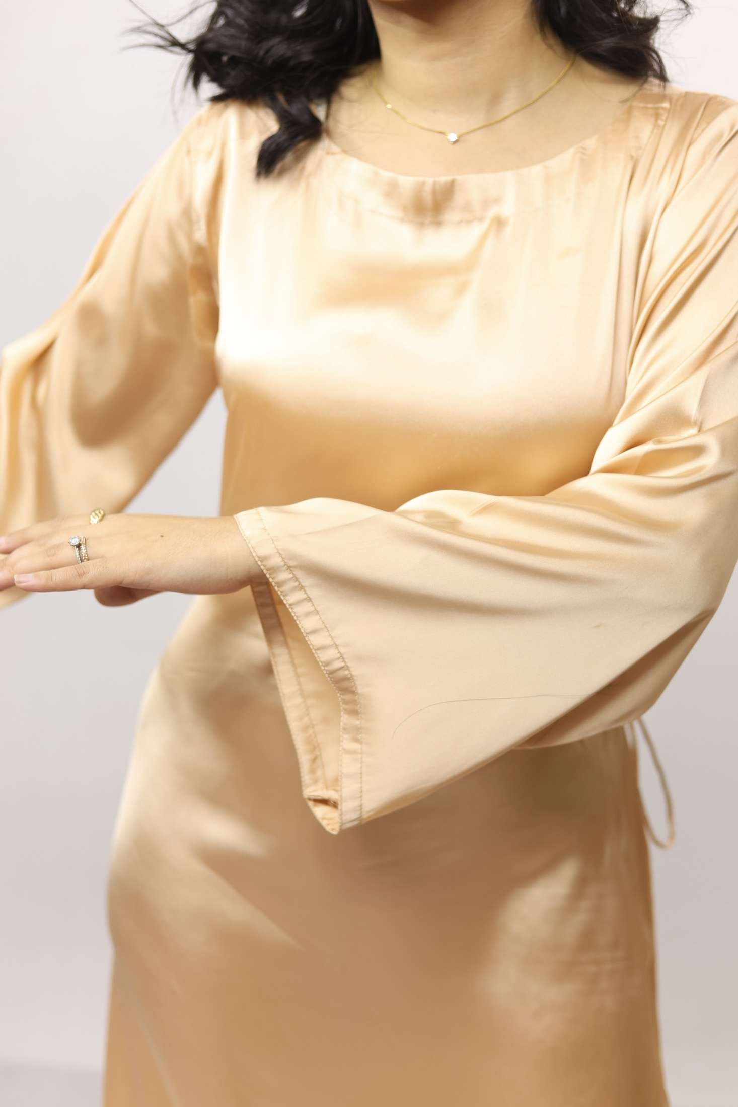 Wraps your silhouette in beige satin, with relaxed sleeves and a criss-cross tie-back that sculpts and defines. Flattering, fluid, and effortlessly chic.