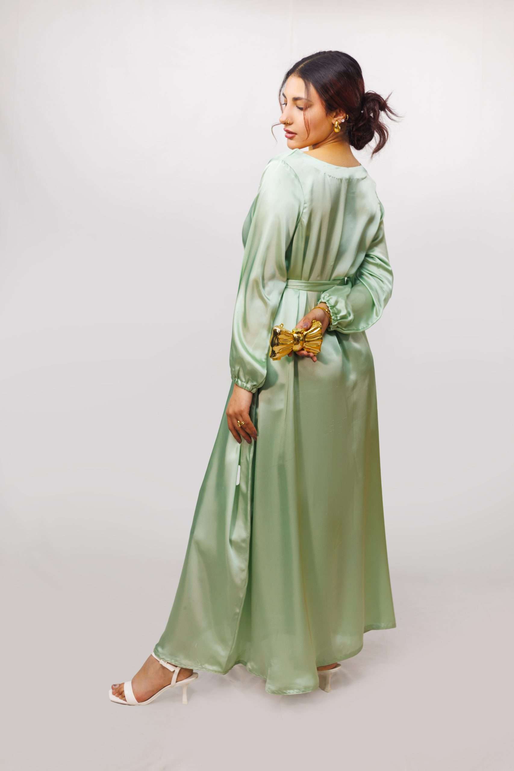 Etherea is a mint green silk dress that speaks of subtle luxury and modern grace. Made from pure silk, it features voluminous balloon sleeves with soft elastic cuffs for added comfort and a touch of drama. The waist-cinching belt beautifully enhances the silhouette, offering a flattering shape.