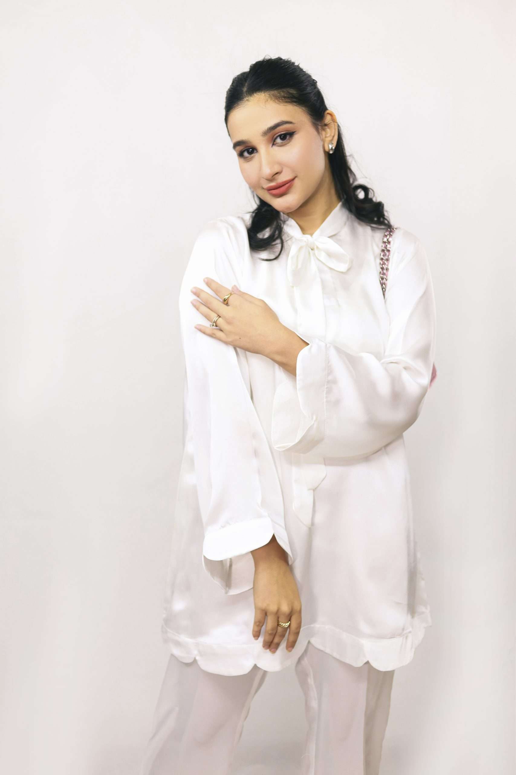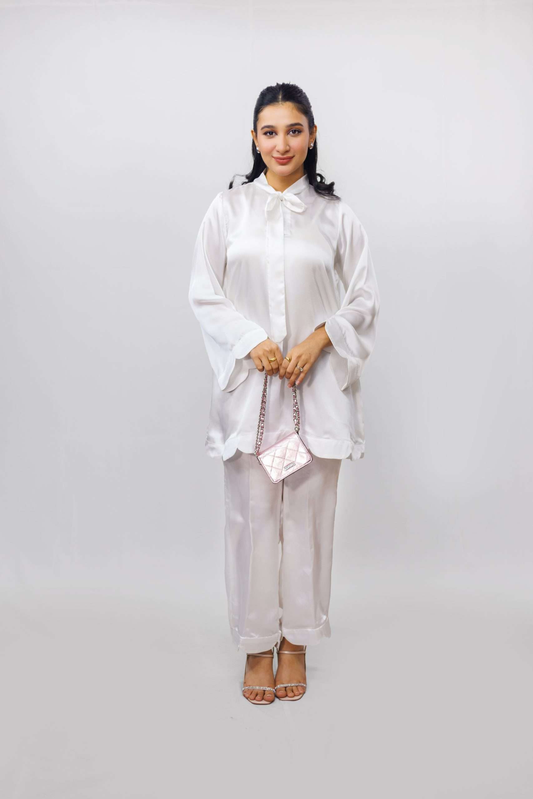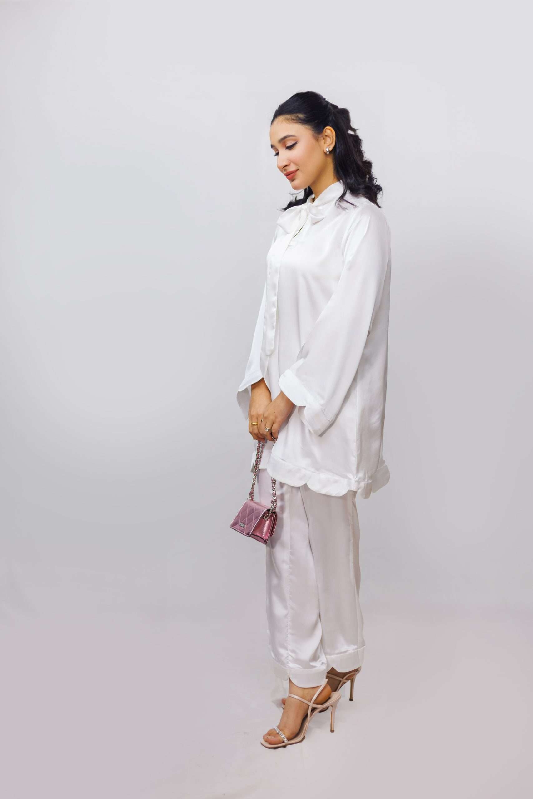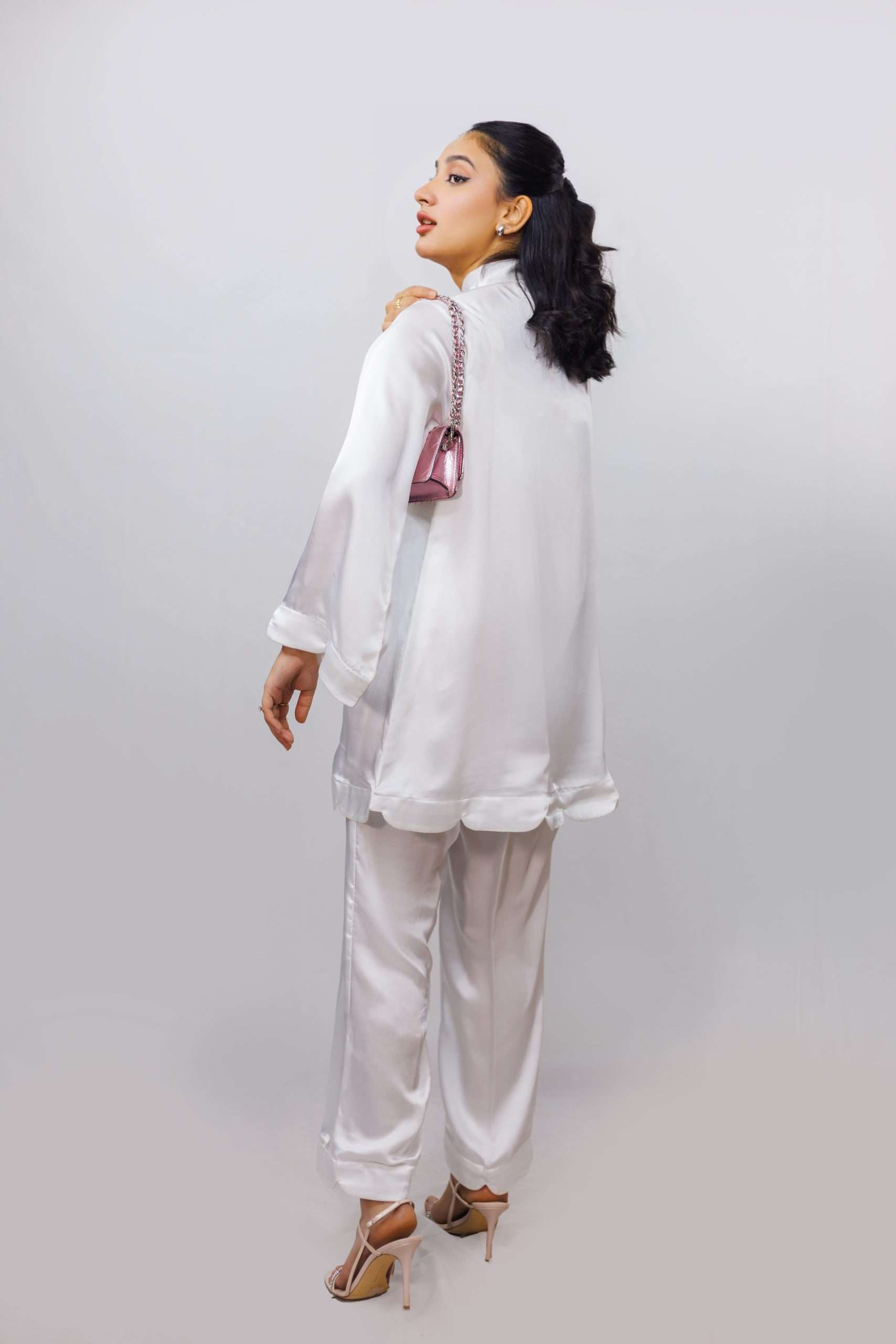 A timeless white silk co-ord set, Lillian features delicate curved cutwork, adding a touch of refinement and charm.